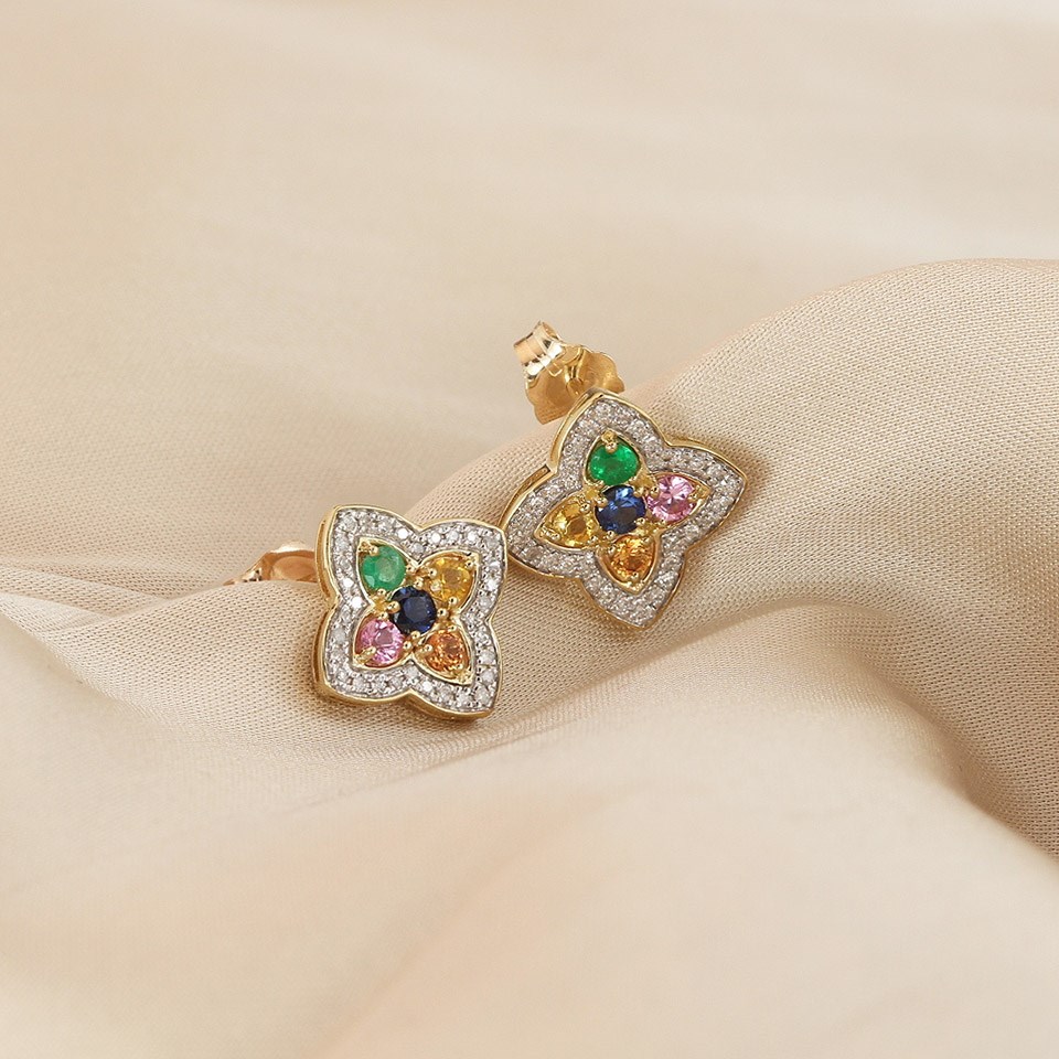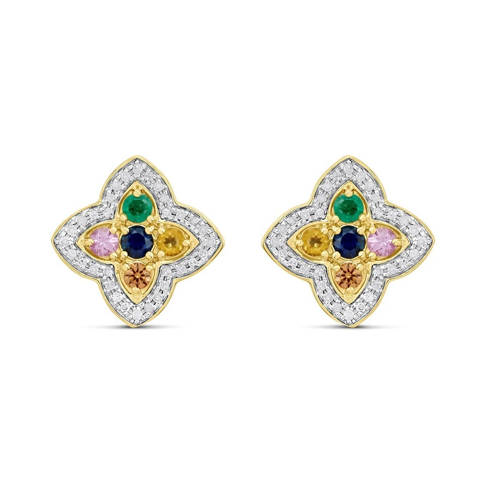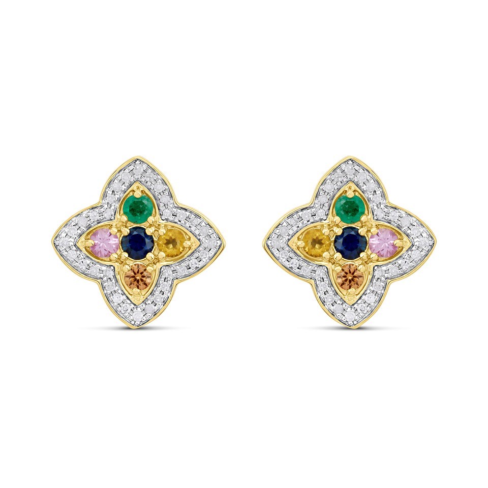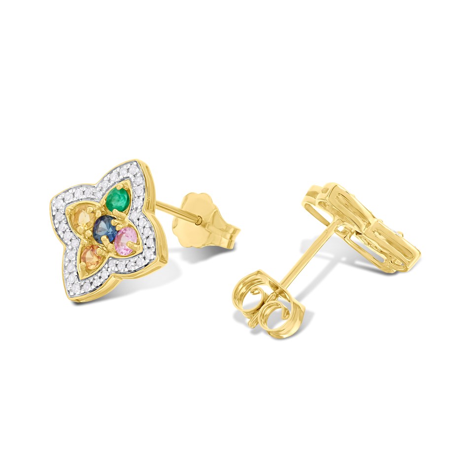 9ct Diamond And Multi-Coloured Sapphire Clover Stud Earrings - D96117