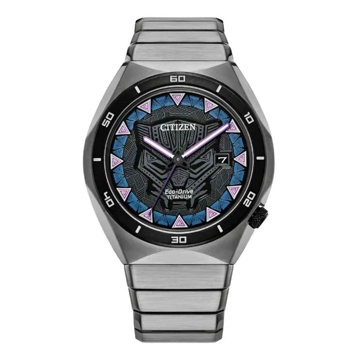 The special packaging includes a Marvel collector's card illustrating the Black Panther's superhero speed in his Wakandan Vibranium suit, made of a magnificent metal that is strong and lightweight, just like Citizen's proprietary Super Titanium™ technology. This exceptional watch is powered by light with Eco-Drive and never needs a battery.