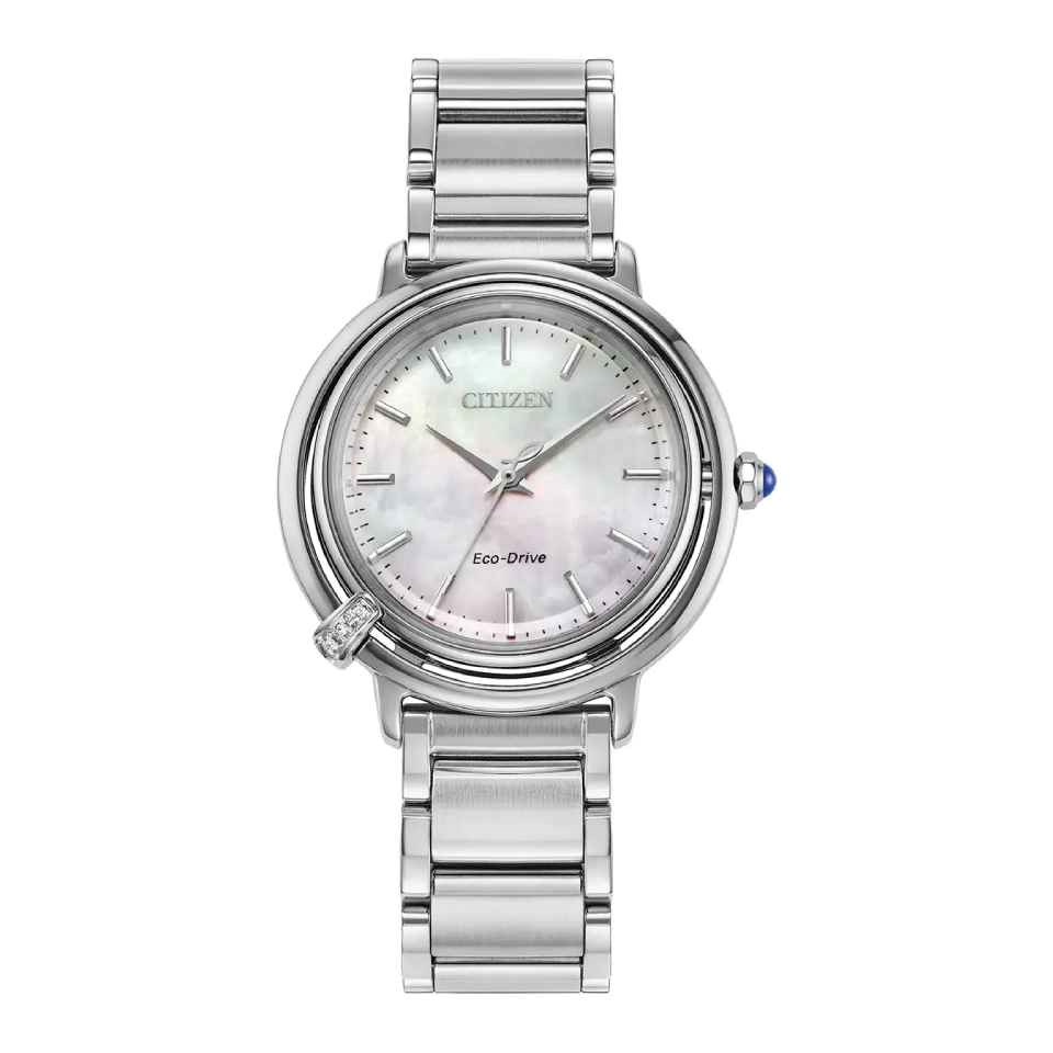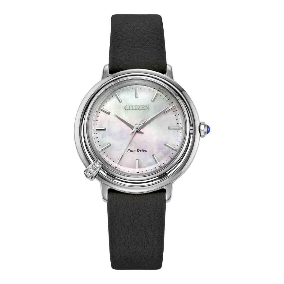 Sleek lines define the watch's 31mm case silhouette, with a subtle crown and small diamond accent adding to its captivatingly delicate look; a black interchangeable vegan apple leather strap adds to its daily versatility. On the mother-of-pearl dial, applied markers and sharp hands indicate the time in style, plus it's sustainably powered by any light with Citizen's proprietary Eco-Drive technology. This elegant women's watch is the perfect addition to any look. Water resistant to 50 metres.
