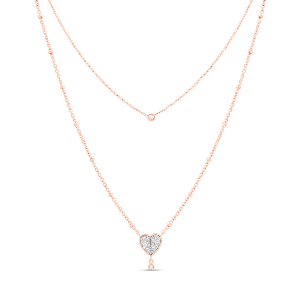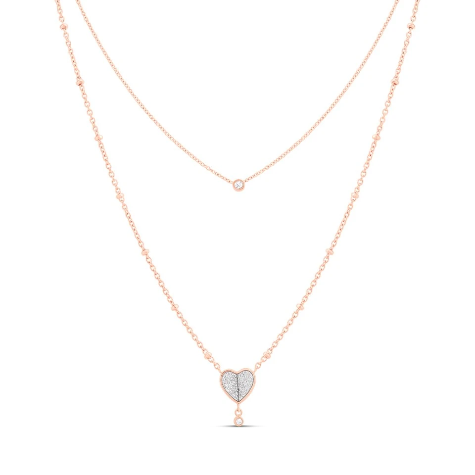 The lower chain showcases delicate bead accents throughout and features a glittering silver-tone heart pendant, outlined in rose gold. Below the heart dangles a small round crystal, adding graceful movement and a touch of extra shine.
