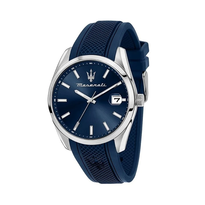 Maserati Attrazione R8851151005 - a classic gents watch from the Attrazione collection, featuring a stainless steel case and blue silicone strap with traditional clasp. The blue dial has silver tone hands and hour markers and a date display window. A simple, functional yet bold watch perfect for any outfit.