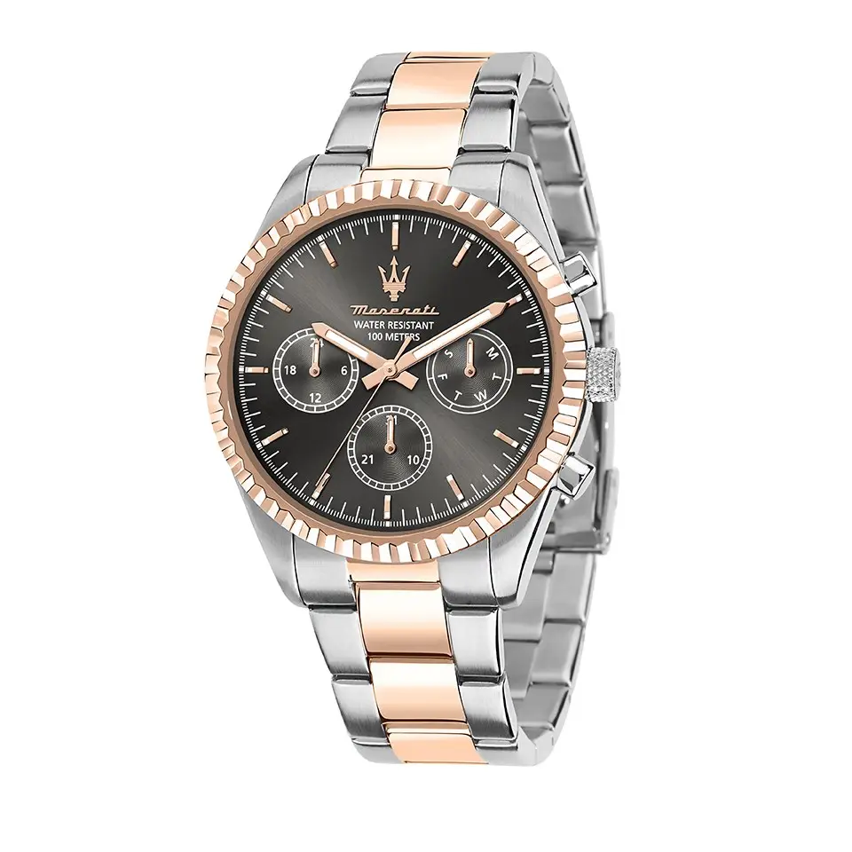 Maserati Competizione R8853100020 - a smart gents watch from the Competizione collection, featuring a stainless steel case and two tone bracelet with a two button folding clasp for a secure fit. The textured rose tone bezel houses the black chronograph dial is completed by rose tone hands and hour markers. A sporty yet classy looking watch for the car and watch lover.
