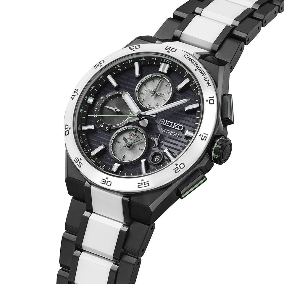 This piece was designed to have a low centre of gravity, making comfortable on the wrist and the bracelet is crafted from titanium and ceramic for lightweight wearing. The micro-adjustable clasp feature adds a more personalised fit. This design is powered by the new in-house 5X83 solar-powered movement, which not only charges efficiently, but also features a 1/20th of a second chronograph function for measuring elapsed time. The subdial at 12 o’clock is for the chronograph feature, the subdial at 9 o’clock for setting modes, and the subdial at 6 o’clock for a dual-time feature.