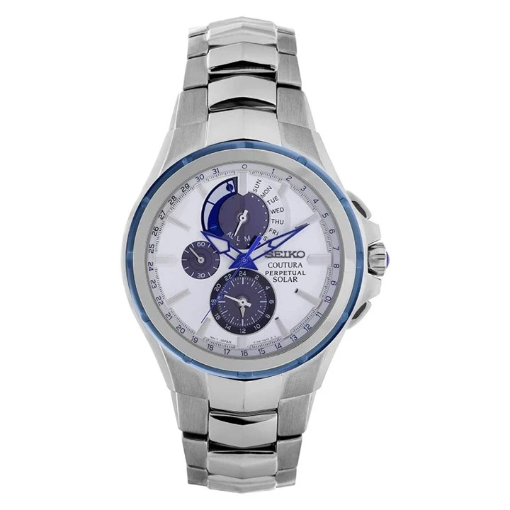 The striking white dial is accented with sharp blue detailing, creating a clean yet dynamic look. Silver tone hour markers and hands ensure clear legibility, while the chronograph function adds practical stopwatch capability. Powered by Seiko’s reliable solar movement, the SSC787P9 harnesses light for energy, eliminating the need for regular battery replacements.