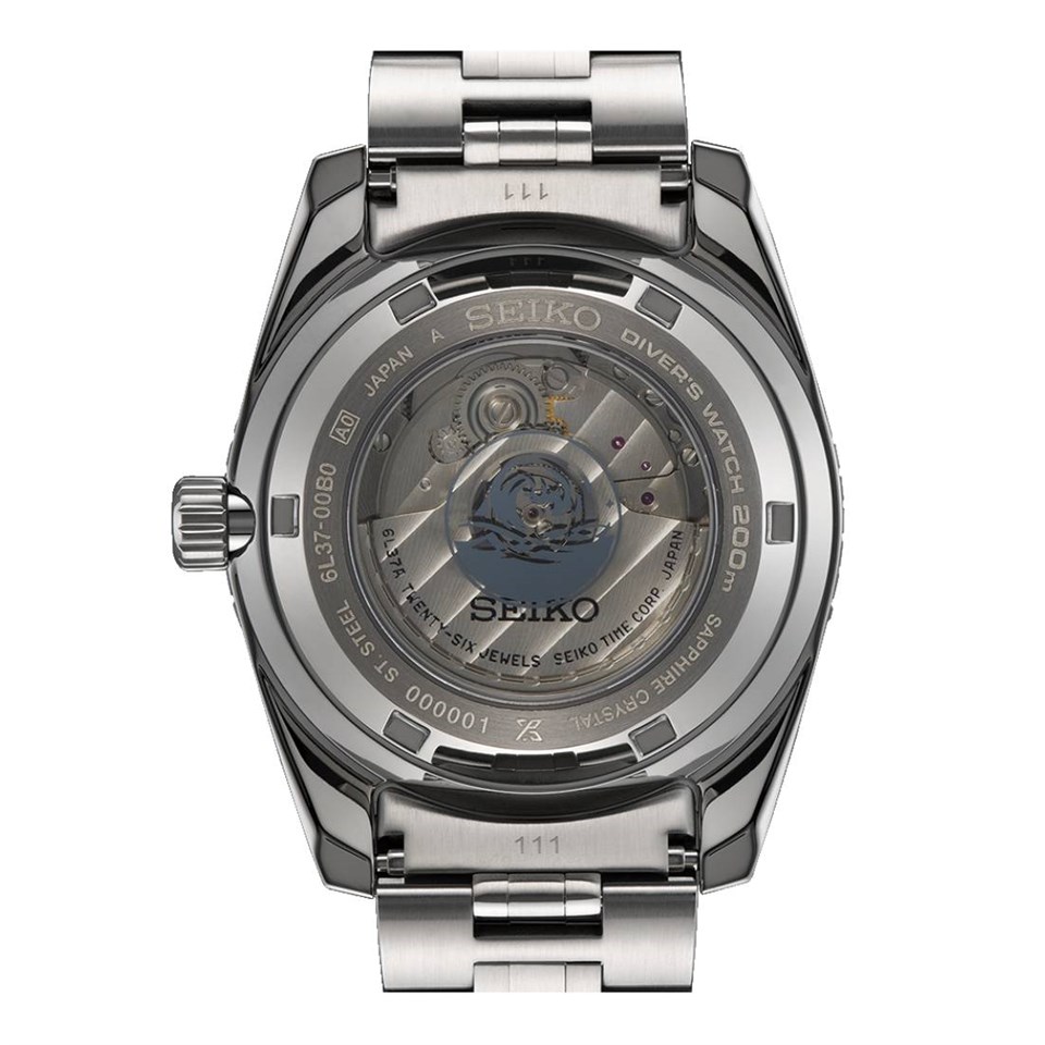 Under a box sapphire crystal glass is a refreshing Aquatic green dial with a textured horizontal pattern. Aside from mirror-finished lugs, it features rectangular Lumibrite-coated indices, reminiscent of the original 1965 Diver. In a more compact case size than previous re-interpretations, it recreates the silhouette of the first piece. The super hard coated case is only 12.3mm, making it the slimmest Seiko mechanical diver at ISO Diving Standard, despite its box sapphire crystal glass and sapphire exhibition case back.