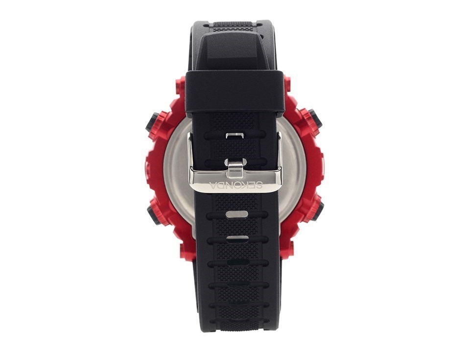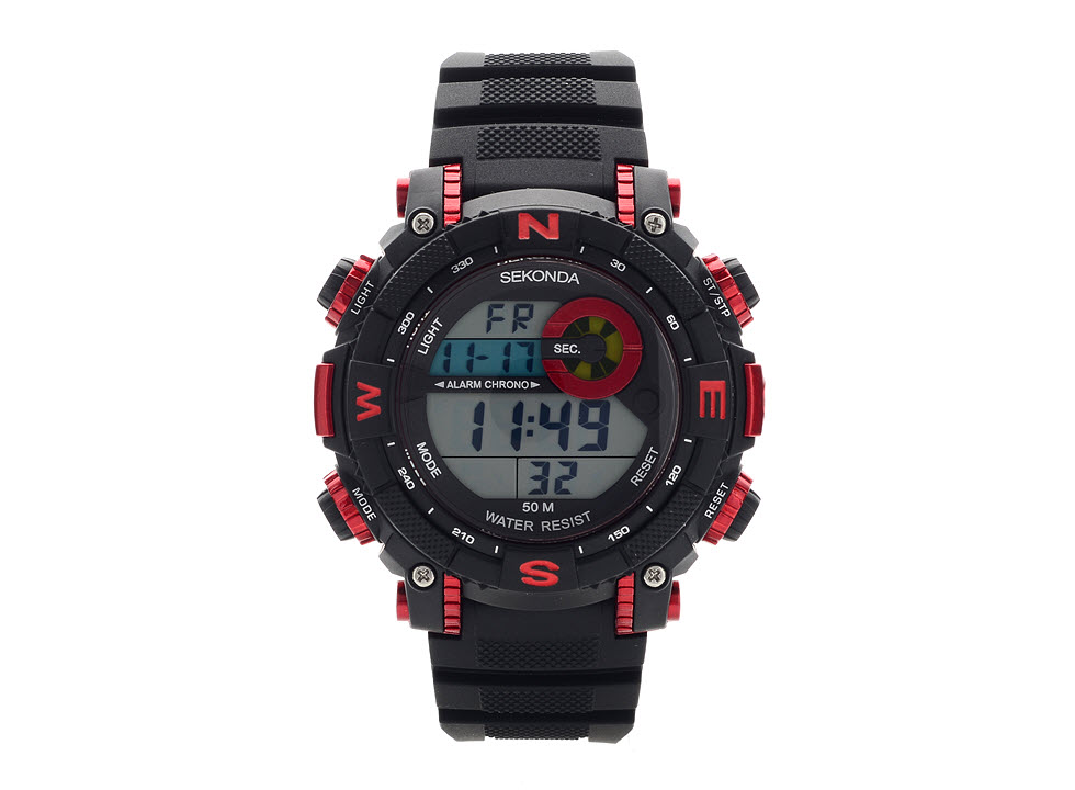 Sekonda 1525 Nevis - although this watch doesn't have an inbuilt compass, the red north, south, east and west markings on the bezel and case give it the feel of the great outdoors. It boasts an alarm, day, date, month, seconds, split time, stopwatch and illumination, all within the robust case on a black resin strap with buckle fastening.