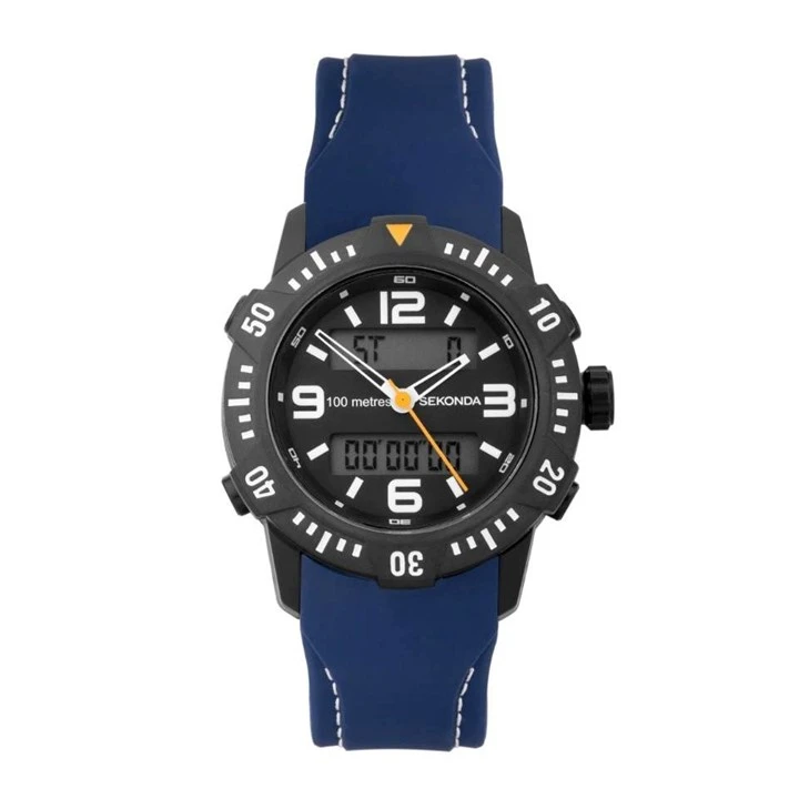 Sekonda 30055 - a great value timepiece from Sekonda featuring a black IP case housing a digital and analogue dial with white accents and a yellow second hand. A blue silicone strap completes the look.