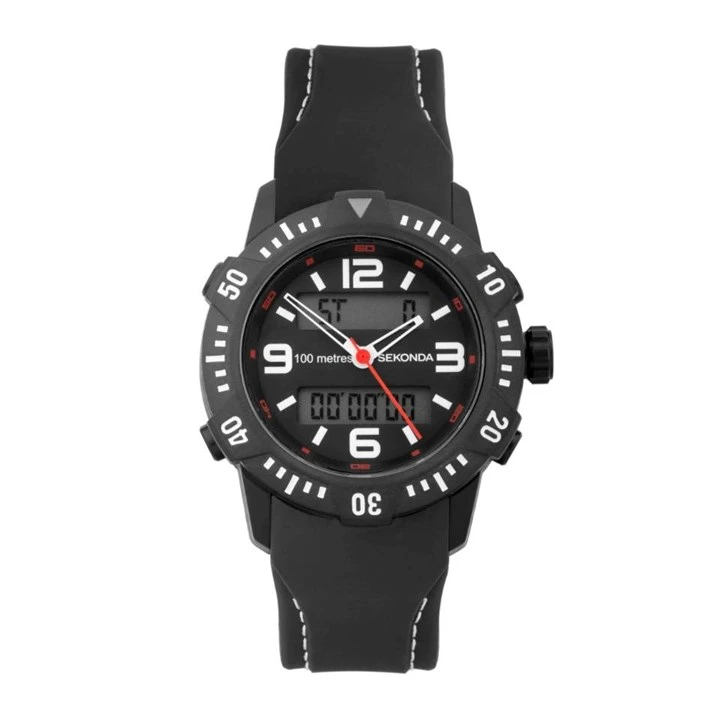 Sekonda 30060 - a great value timepiece from Sekonda featuring a black IP case housing a digital and analogue dial with white accents and a orange second hand. A black silicone strap completes the look.