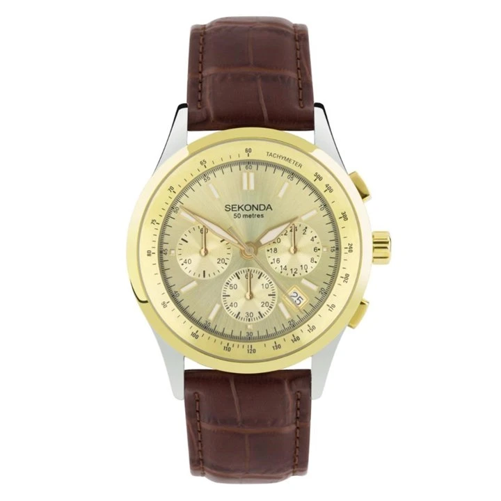 Sekonda 30110 - this chronograph watch from Sekonda has a two tone case with a champagne dial. The watch is fastened with a brown, croco grain leather strap and features include a 1 second chronograph timing up to 60 minutes, tachymeter markings and a date display.