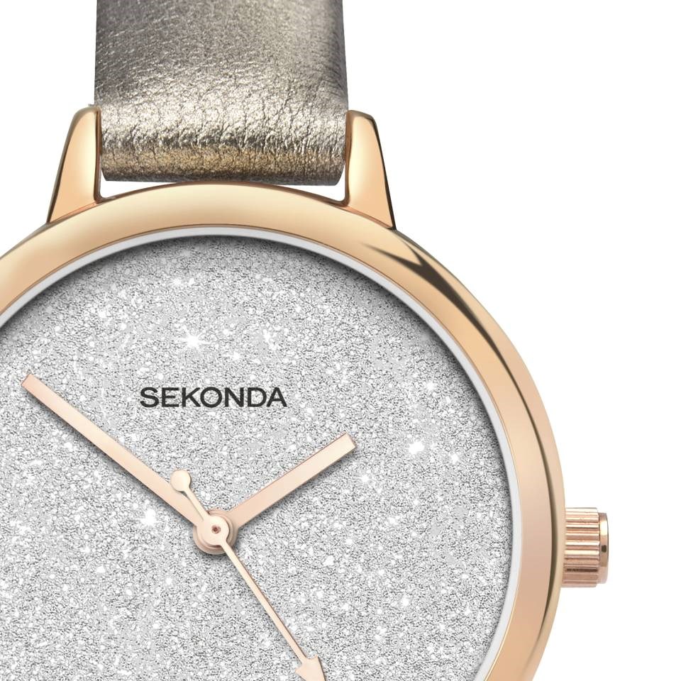 Sekonda 40023 - this great value ladies watch from Sekonda features a round ionic plated rose gold coloured case housing an eye-catching silver glitter dial. The watch is fastened with a metallic bronze coloured PU strap.