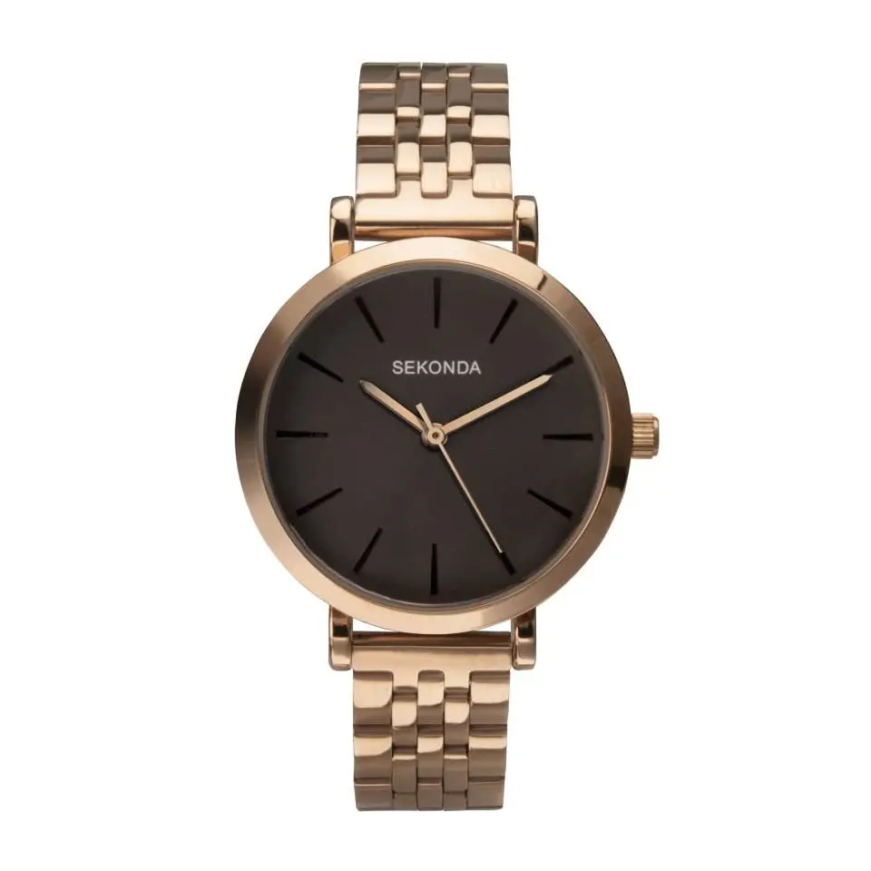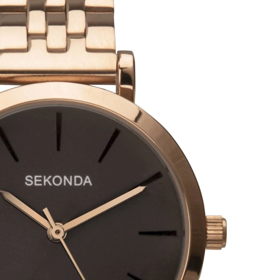 Sekonda 40303 - this classic, minimalist ladies watch from Sekonda features a round, rose gold coloured case housing a dark grey dial. Fastened with a rose gold coloured stainless steel bracelet with double push button folding clasp.