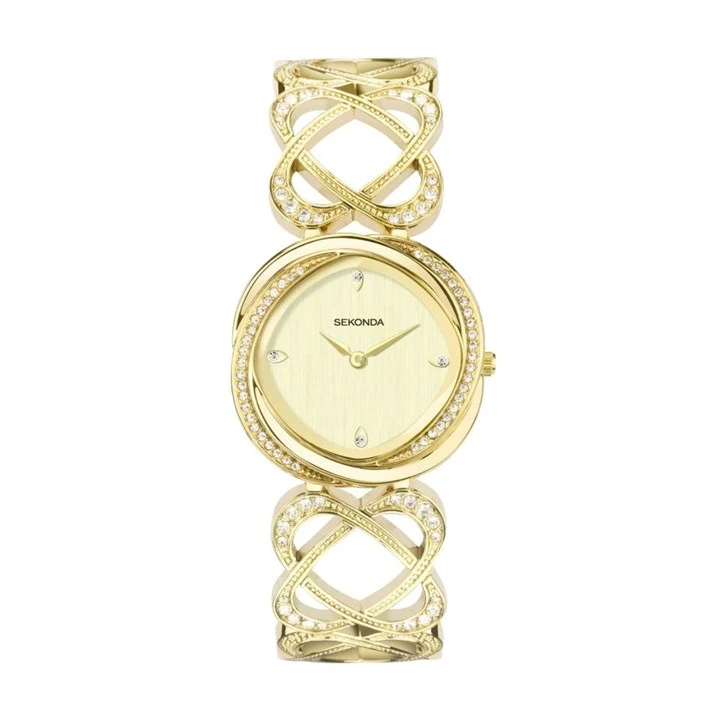 Sekonda 40601 Hidden Hearts - the stunning Sekonda watch with a stone set, ion-plated gold alloy case and a champagne stone set dial. Fastened with a stone set, gold alloy bracelet, the watch is embellished with 88 crystals on the case, dial and bracelet.