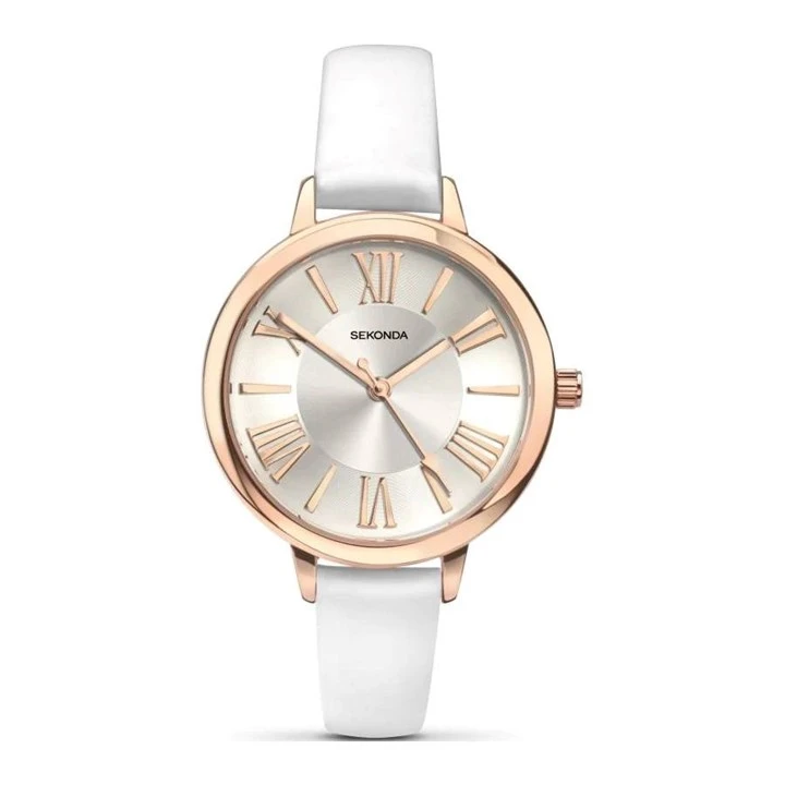 Sekonda Editions 2327 Summertime - designed with summer in mind; this pretty watch features rose gold tone hour indicators and matching hands, set against a white metallic dial, inside a rose tone case. The slim white leather strap with buckle, looks perfect against sunkissed skin!