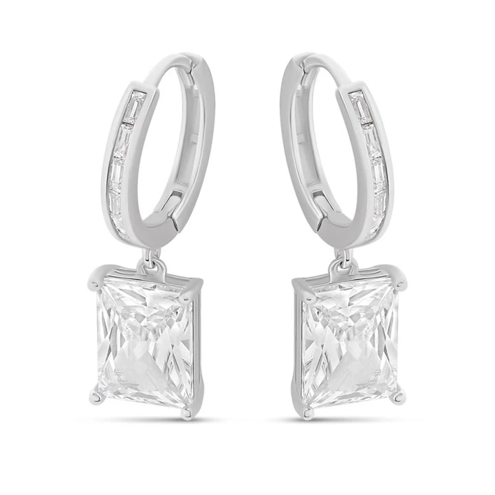 Silver CZ Rectangle Drop Hoop Earrings - F13153