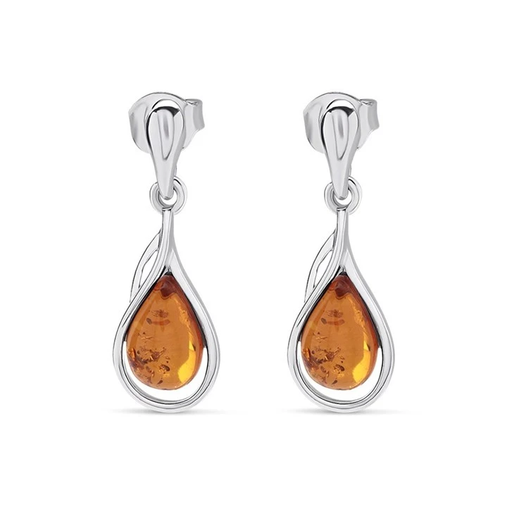 Silver Cognac Amber Teardrop Earrings - 25mm drop - F1211