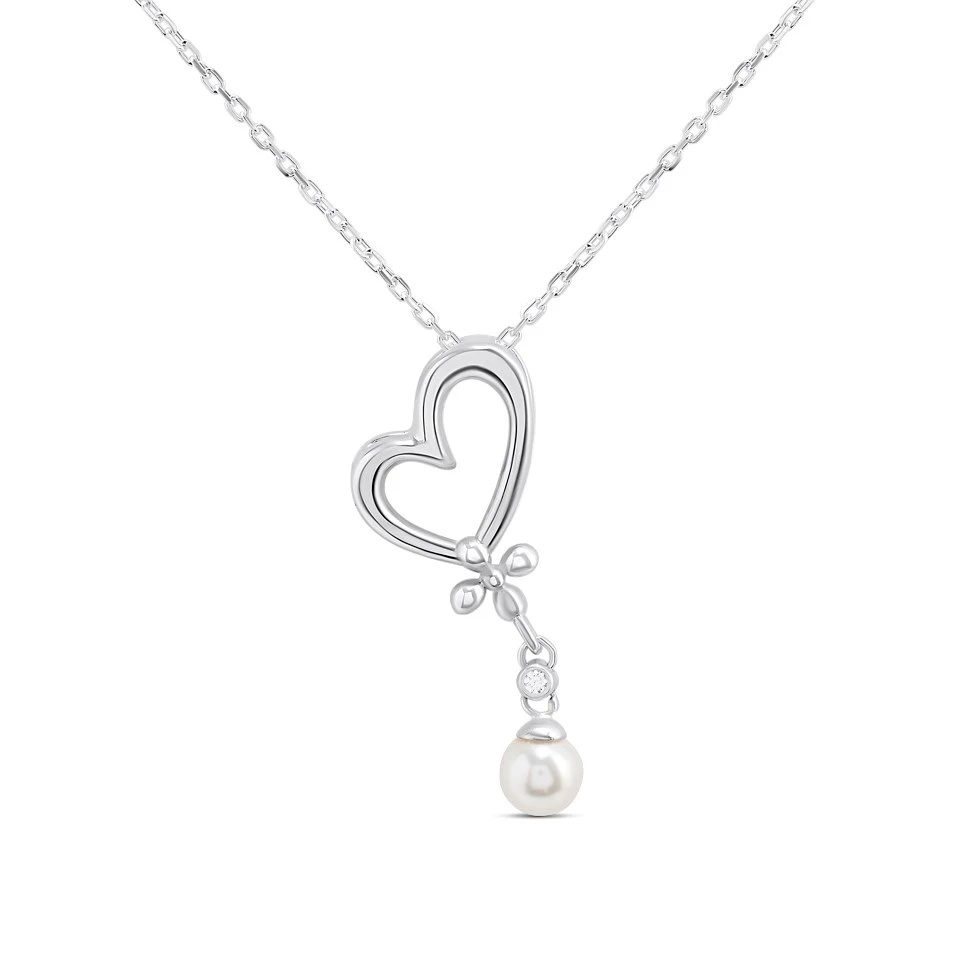 Silver Heart Synthetic Pearl And CZ Necklace - F34109