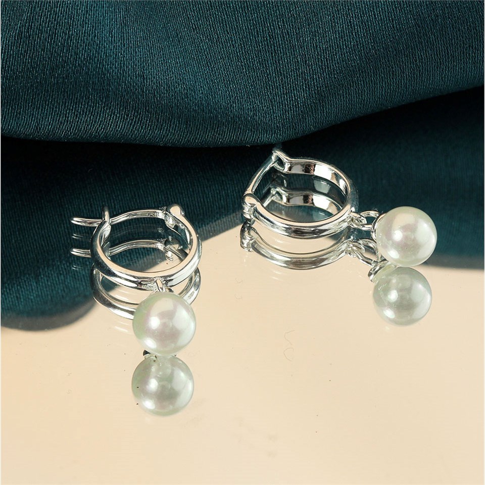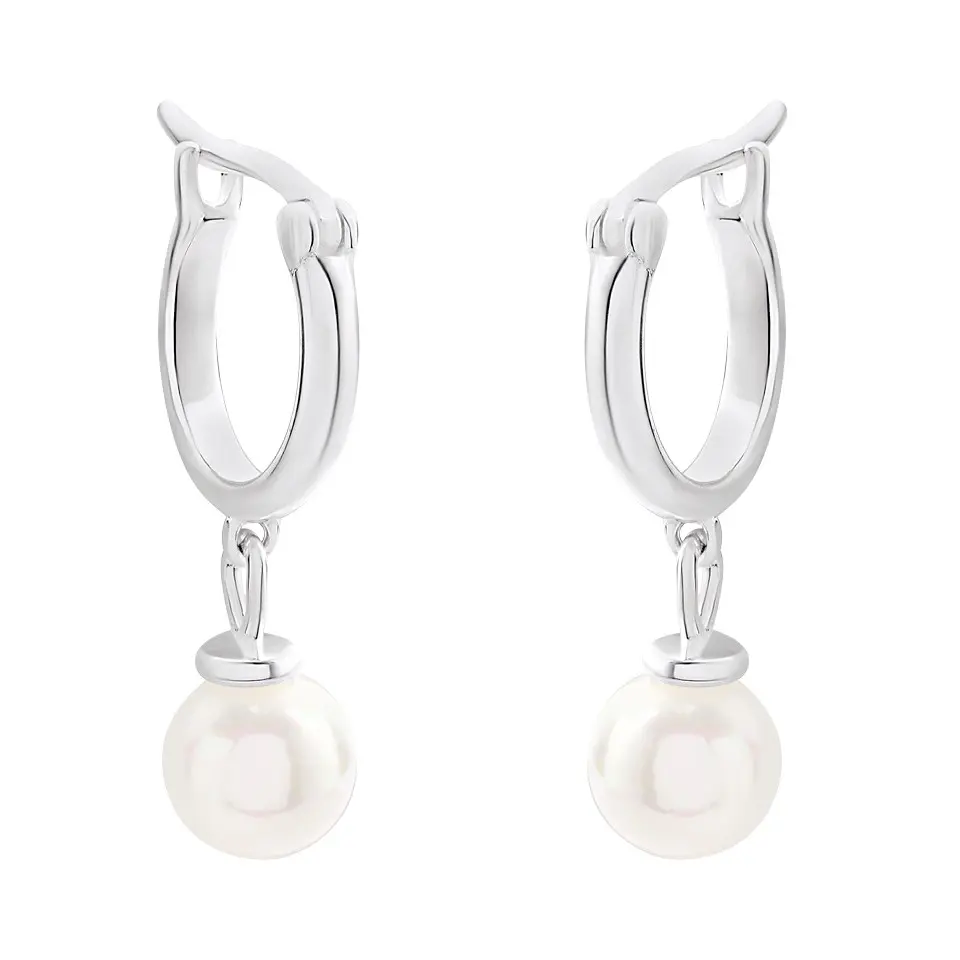 Silver Simulated Pearl Drop Hoop Earrings - F13148