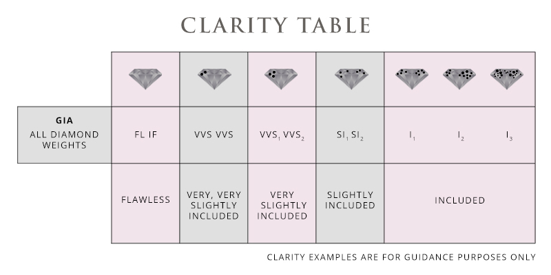 All diamonds are unique and will contain naturally occurring inclusions or small flaws. Often minor and formed when the diamonds were created in the earth, some inclusions are hardly visible to the naked eye. However, the clarity of your diamond is worth considering, especially in relation to the position the diamond will be set in the ring.