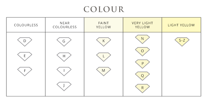 We use the GIA scale (set by the Gemological Institue of America) to measure the colour of your diamond. A diamond with colour grade D is colourless – this scale increases to grade Z, which will have a yellow tint. Diamonds with distinct colours, such as very yellow or deep brown tones, are classed as fancy diamonds and are graded separately to colourless to clear diamonds.