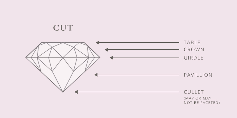 Cut refers to both the style and shape the rough crystal is skilfully crafted into. A good diamond cut can bring out the brilliance, taking into consideration symmetry and proportions to ensure the light is reflected throughout the diamond. Different shapes and cut styles create different effects, but a well cut diamond will noticeably sparkle as it catches the light.