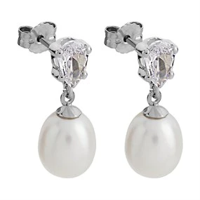 9ct White Gold Pearl And Cubic Zirconia Drop Earrings - 18mm drop - G14111